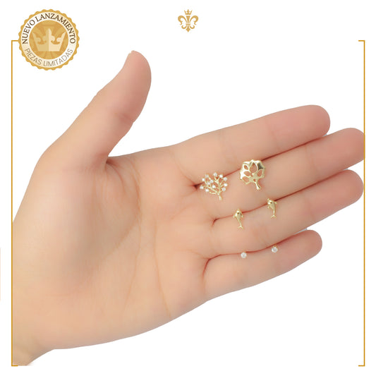 Aretes Broquel Arbol De La Vida Con Cristales Y Delfin Liso En Oro Laminado