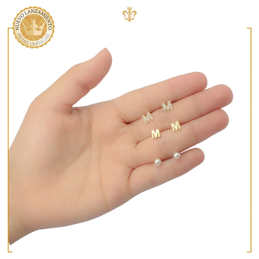 Aretes Broqueles Juego De 3 De Inicial Letra M Para Dama Con Cristales