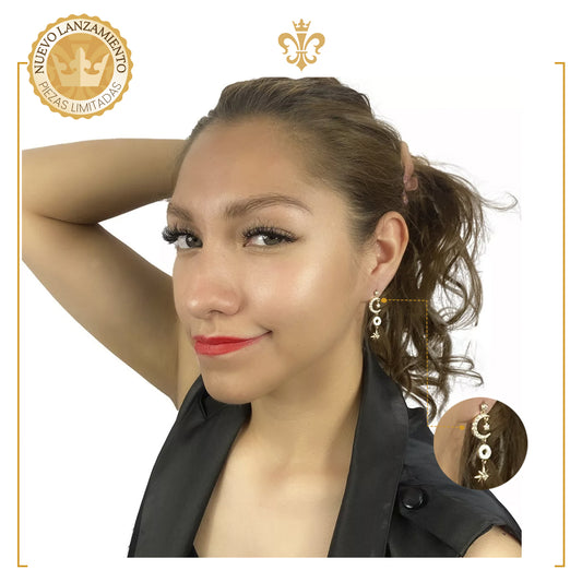 Aretes De Bolita Broquel De Luna y Estrella Con Swarovski Para Mujer