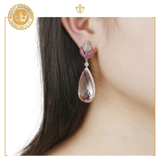 Aretes Largos De Tulipán Con Cristales Para Mujer En Oro Laminado