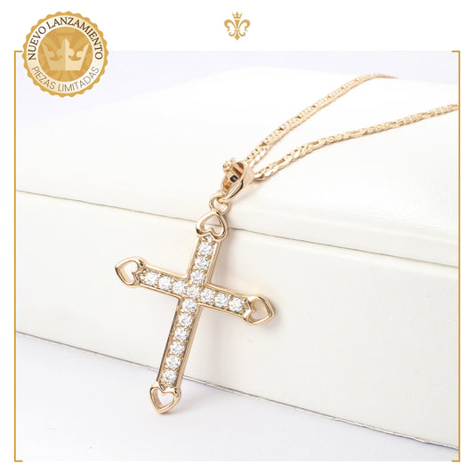 cadena de figaro con dije de cruz con corazones