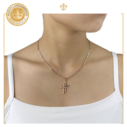 cadena figaro con dige diseño de cruz lisa y cristales en oro laminado 18k