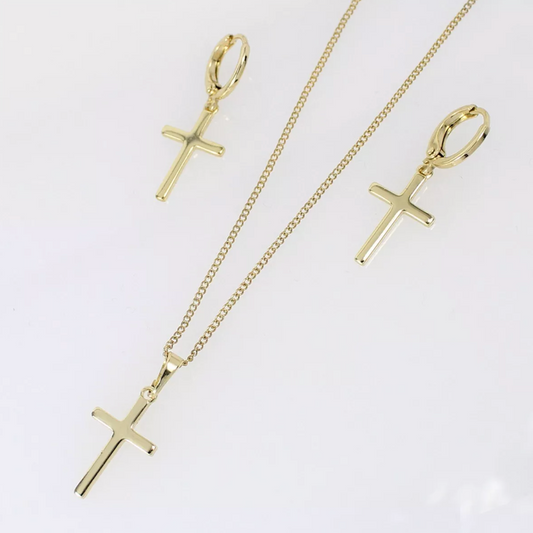 juego de joyería aretes broquel y dije de cruz liso pulido para mujer oro laminado