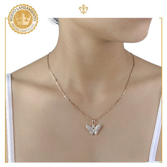 collar con cadena delgada en oro laminado con dije de mariposa diamantada dorada y cristales para mujer