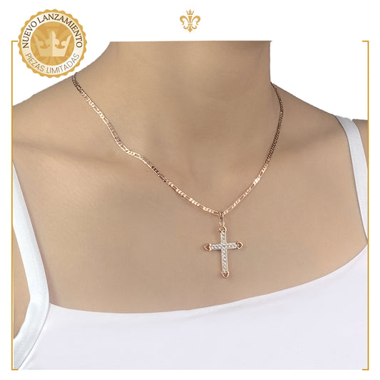 Collar con dije crucifijo con corazones diamantada y cadena delgada para mujer oro laminado