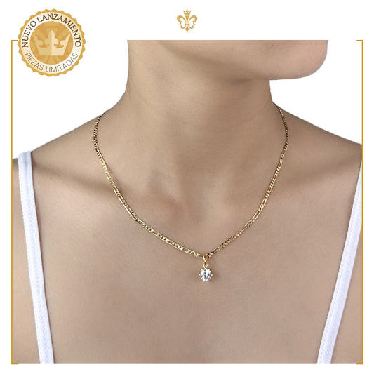 cadena tipo figaro con dije solitario de cristal diamante en oro laminado 24k para mujer