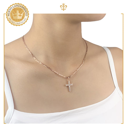 Collar Cadena Delgada Figaro Con Dije De Cruz con cristales en oro Rosa