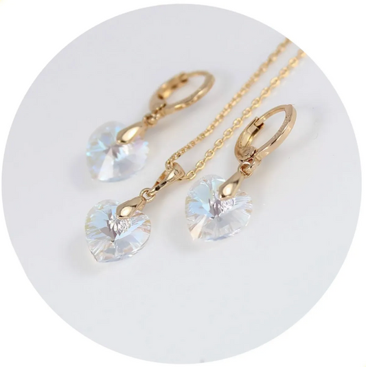 Juego Aretes con Dije De Corazón y Cristal Diamante en Oro Laminado para mujer